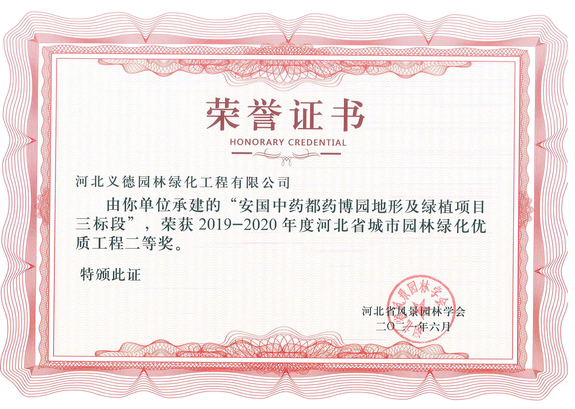 近幾年來我公司被授予2019年-2022年河北省扶貧龍頭企業、2018年國家林業標準化示范企業、2019年度全國苗圃50強、2018-2019年度河北省林業重點龍頭企業、2018年保定市精品特色現代農業園區、2018年度保定林木種苗協會授予特色苗圃、2018年度北方十佳特色苗圃、2016-2019年河北省建設工程招標投標誠實守信5A級施工企業等榮譽稱號,2017年保定市林木種苗龍頭企業、石家莊市2017年度優秀園林企業。